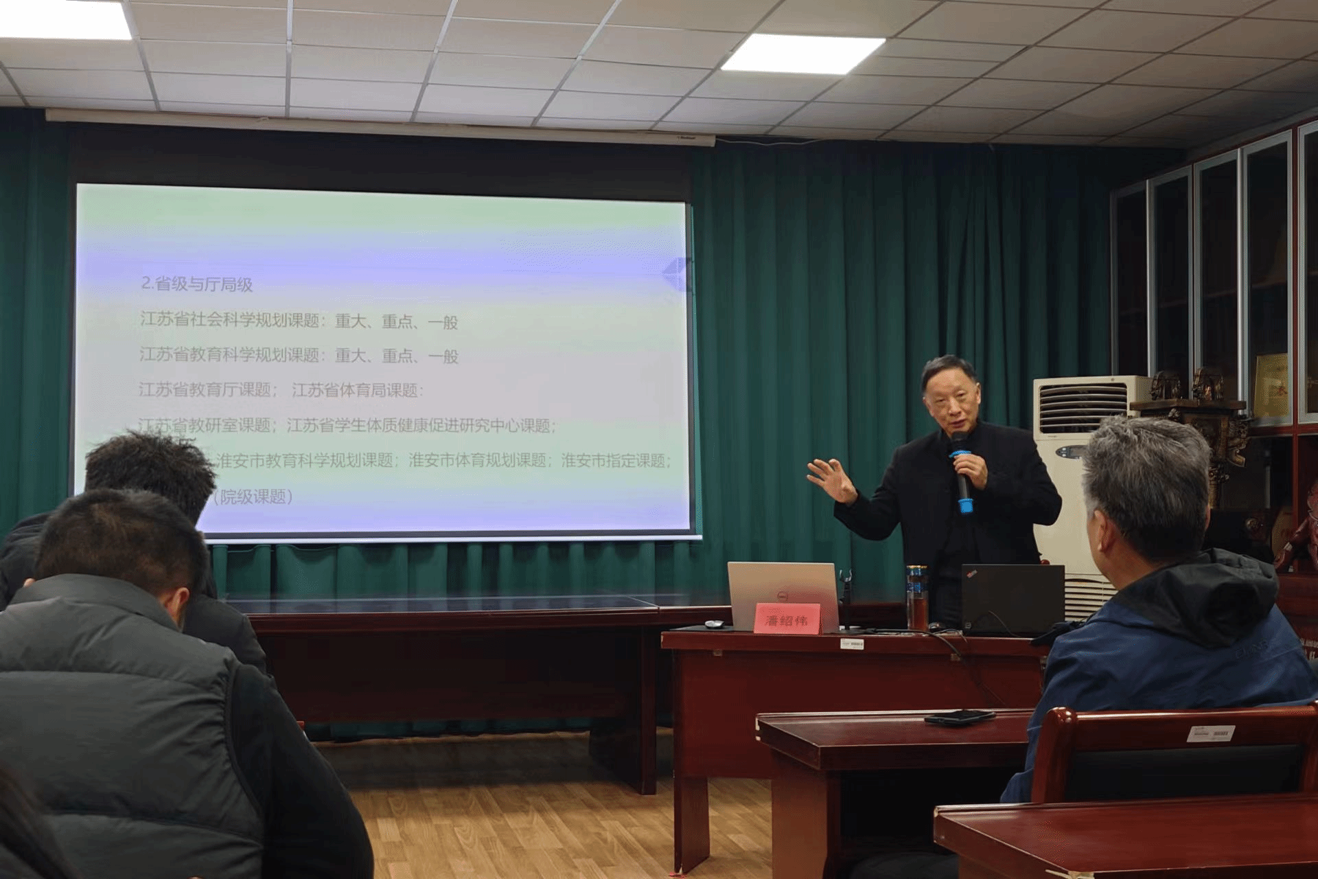 为进一步推进安博网页版有组织科研,凝聚力量、打造队伍,2024年1月15日下午15.00,教育部全国高等学校体育教学指导委员会委员、中国体育科学学会学校体育专业委员会委员、扬州大学二级教授、扬州大学体育科学学院院长潘邵伟教授在我院大会议室举行《科学研究课题撰写与申报技巧》专题讲座。