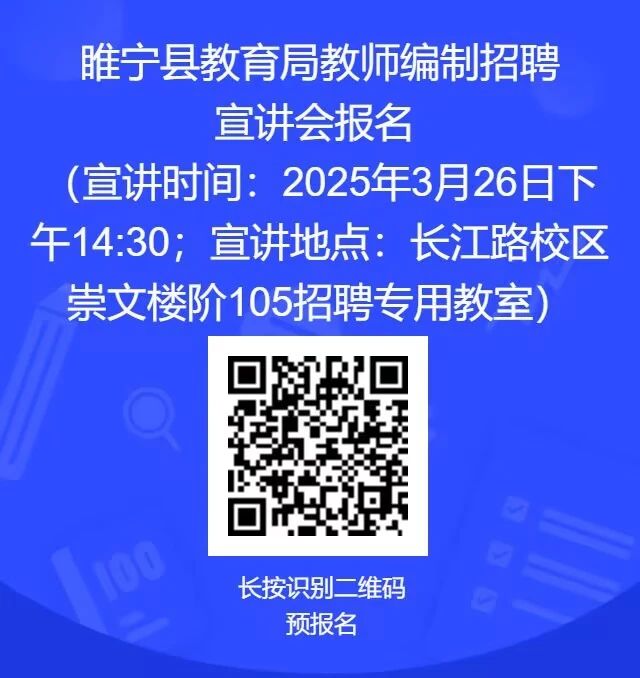 《睢宁县面向2025年毕业生公开招聘教师公告》在徐州市人力资源和社会保障局网站(http://hrss.xz.gov.cn)、睢宁县人民政府官网(http://www.cnsn.gov.cn/)和睢宁教育星空微信公众号(snjyxk)发布,具体的岗位名称、招聘人数、资格条件等详见《睢宁县面向2025年毕业生公开招聘教师岗位表》(附件1,以下简称《岗位表》)。