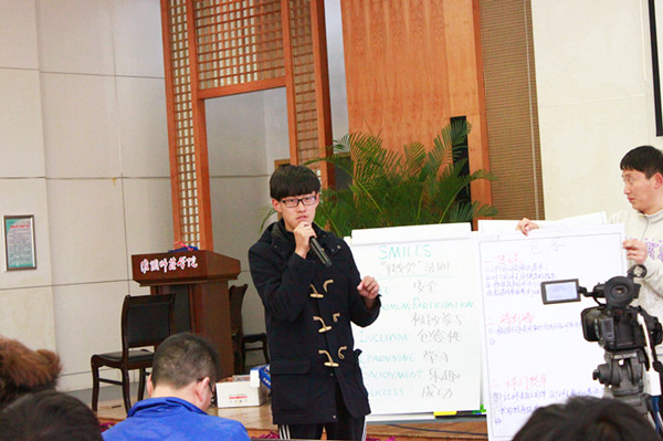 上午进行的是先进的足球理念学习,下午理论与技能结合运用的实践课。第二天上午进行总结,检验教练员们的学习、实践成果,使我们教练员们更好的掌握了足球知识、技能。在这次培训中,徐志斌老师独特的教学风格,让参加培训的教练员们耳目一新。在教学中,徐志斌老师通过有趣的高效热身,让学员亲身体验,然后让学员们以小组的形式讨论传统热热身的弊端。在学习中,学员通过亲身体验提出各种各样的问题,徐志斌老师则在回答问题中,让你亲身参与其中。他在教学策略中提出‘“由上及下”的教学方法,并提出教练员应当给予孩子的不仅仅是技能,更重要的是球商。在带球,过人,转身的传统教学步骤中,更是提出:“挫败体验”、“成功体验”、“挑战体验”三种体验运用。并让学员们积极讨论如何运用这三种体验来提高教学质量。
