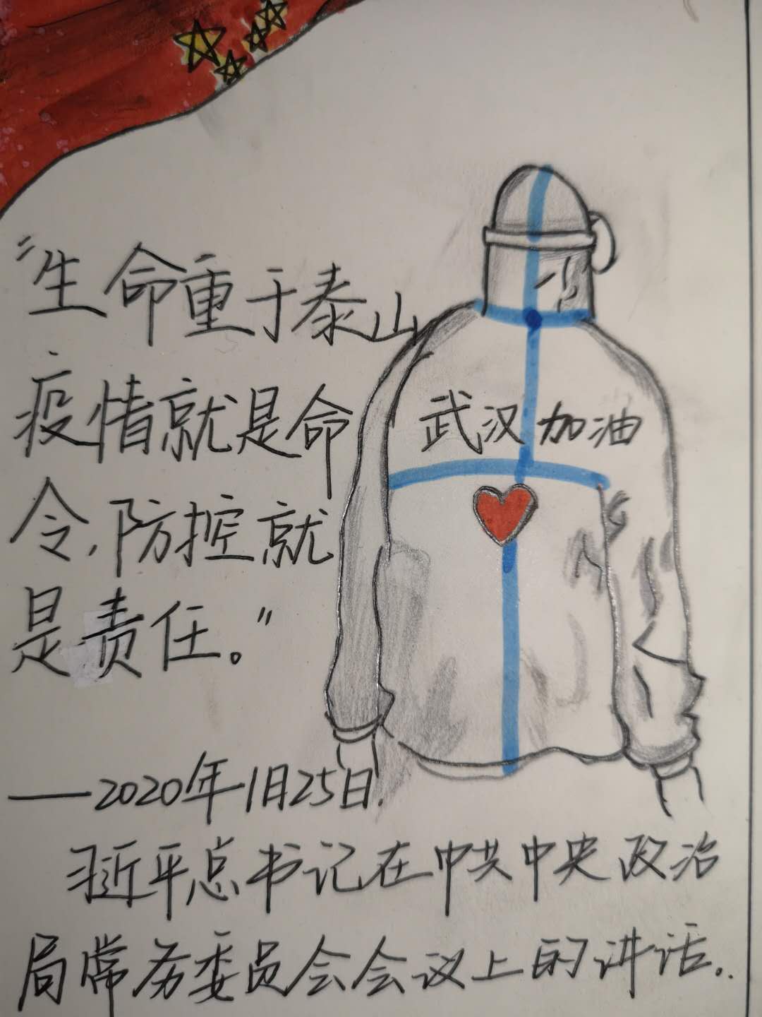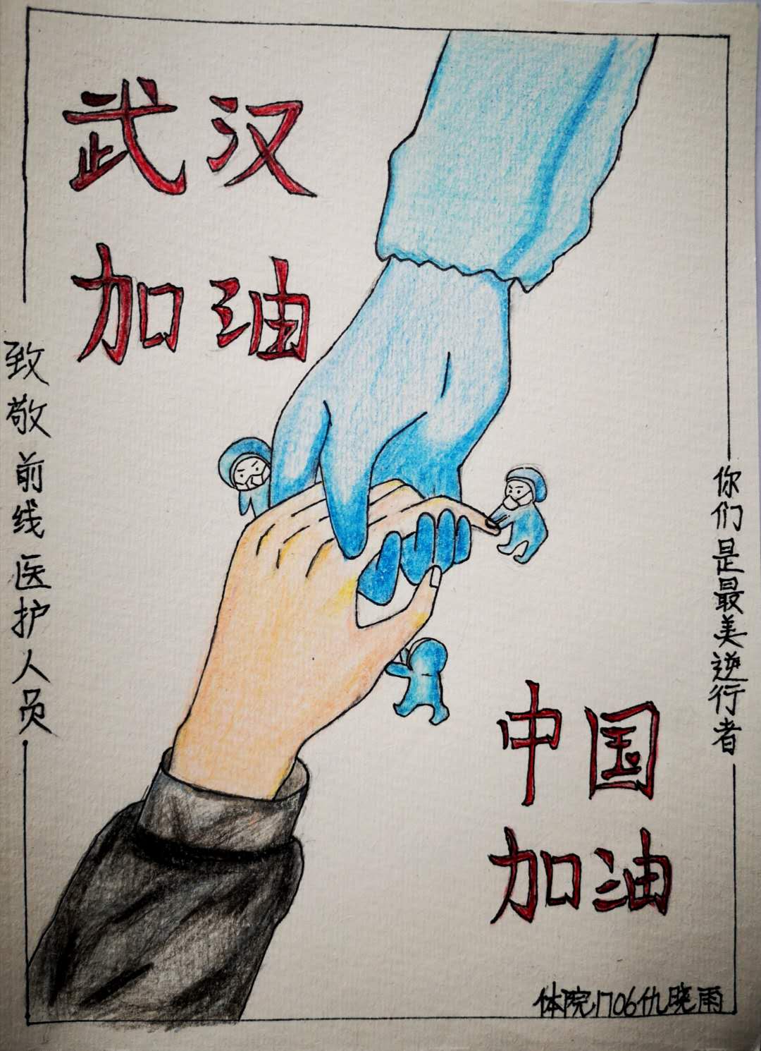 同学们一笔一画制作了“为白衣天使加油”、“为武汉加油,中国加油”等问候语,配上温馨的图画;录制一天生活色彩,展示自己宅家真实生活写照;“声”临其境,为爱国电影配音。优秀作品通过学院微信推送,让全体同学坚定同心战“疫”的决心,为早日打赢防疫阻击战加油助力!