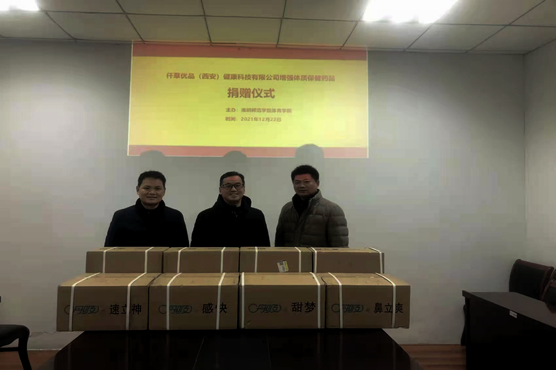 2021年12月22日上午,仟草优品(西安)健康科技有限公司向淮阴师范学院安博网页版捐赠“丹吸”(速立神480盒、感快480盒、鼻立爽480盒、甜梦480盒)系列产品,共计157920.00元,用于师生健康防护。”安博网页版副院长蔺新茂对仟草优品(西安)健康科技有限公司领导及全体员工的深情厚意表示感谢,同时表达要用好管好这批药品。