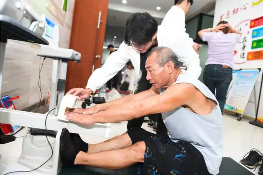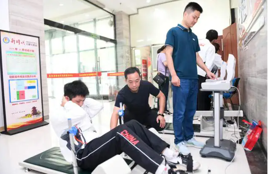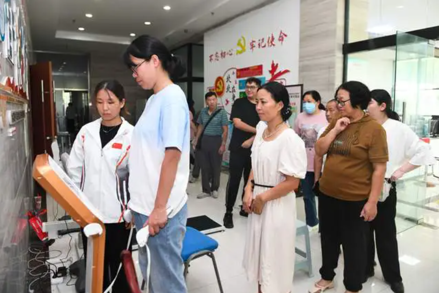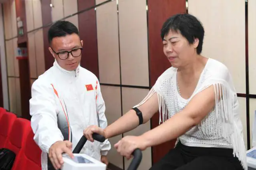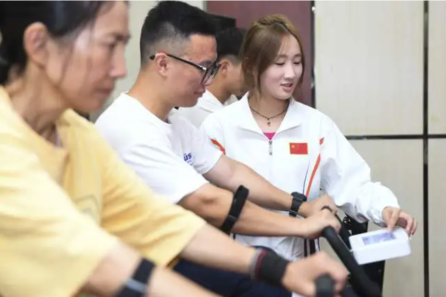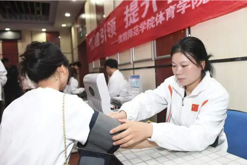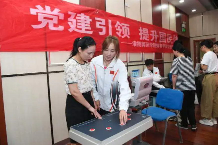 在社区活动中心,师生们为社会群众量血压、称体重、测肺活量及灵敏度等,利用全新的体质健康测评系统为大家进行体质健康评估,并立足健康游戏训练方式开展趣味体育知识普及和传播。