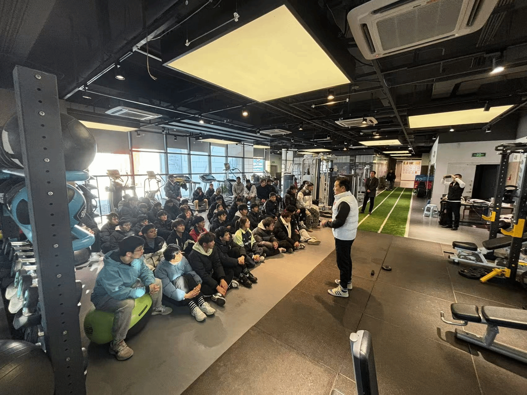随后,师生们来到竖立健身。俱乐部负责人向大家详细介绍了竖立健身的发展历程、经营理念和服务特色。学生们依次参观了有氧训练区、力量训练区、团体课程教室等各个功能区域,并参与了动感单车、搏击操等热门课程的体验。在课程中,教练们充满激情的指导和会员们积极投入的状态,让学生们深刻感受到了健身运动的活力与魅力。刘巧芳副教授鼓励学生们要学习教练们的专业精神和教学方法,为今后从事社会体育工作积累经验。张秋实博士则从健身行业的发展趋势和人才需求等方面,为学生们进行了讲解和分析,引导学生们思考如何在未来的职业发展中找准定位,发挥自己的专业优势。