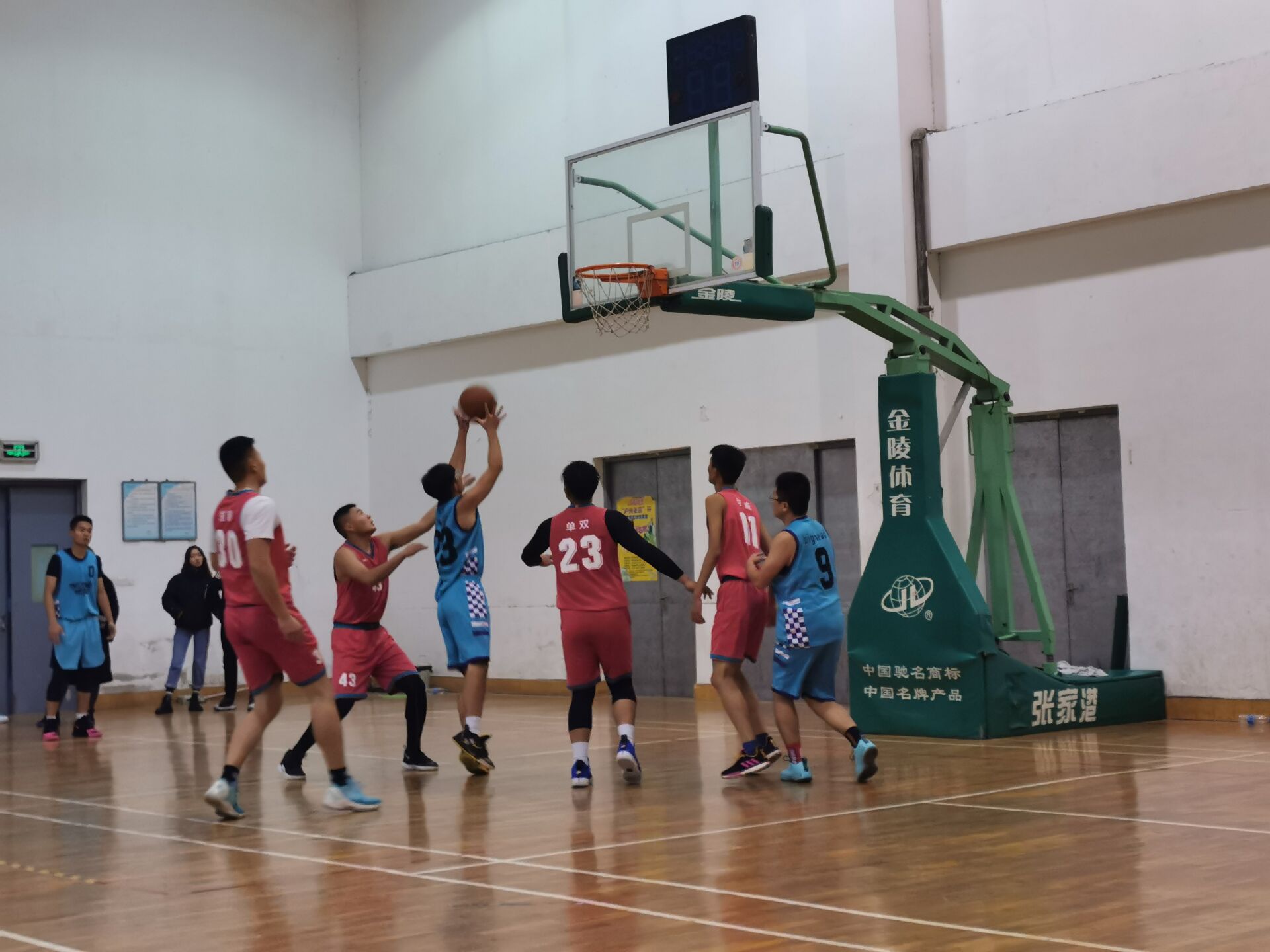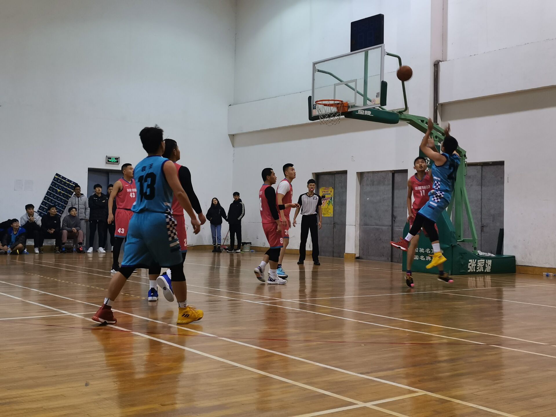 在比赛一开始,其激烈程度不言而喻,双方都使出浑身解数。1705班率先夺下两分,1803班也不甘示弱,随后在彼此的默契配合下,在观众的呐喊声中也拿下了两分。然而1803班的奋力拼搏,积极进攻终究敌不过1705班,输掉了此次比赛。1705班凭借着滴水不漏的团队防守,配合流畅的整体进攻和命中率极高的三分投篮,以54:37的得分赢得本场比赛。